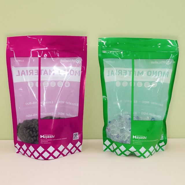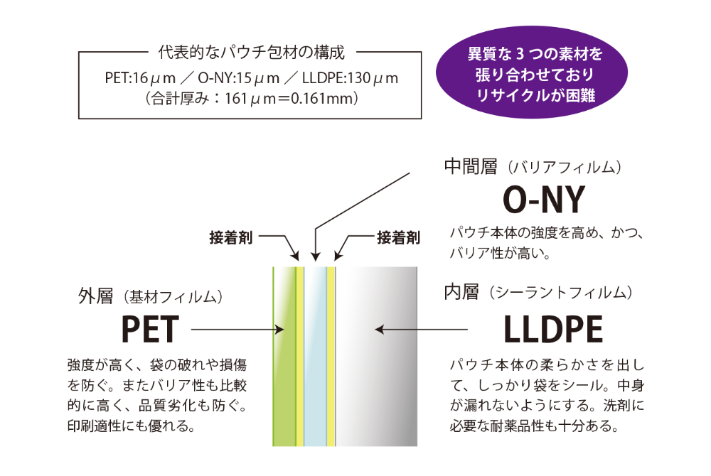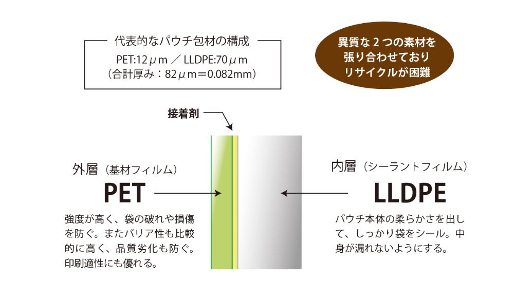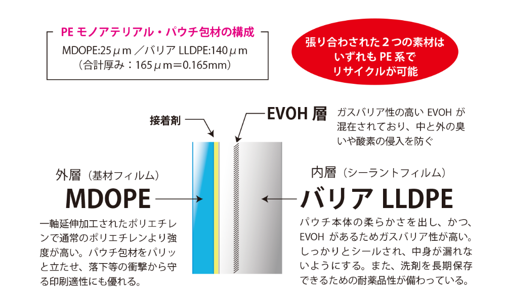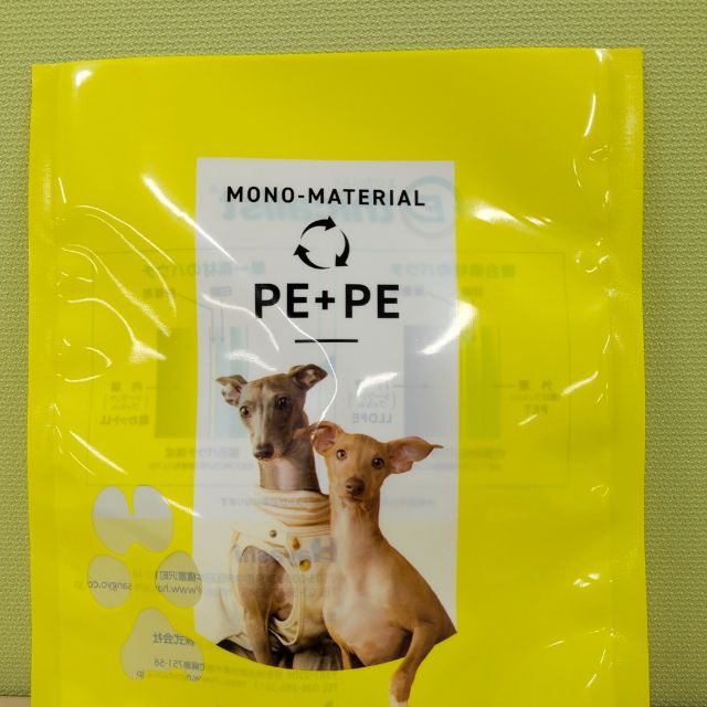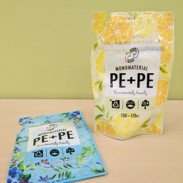 張り合わされた2つの素材はいずれもPE系でリサイクルが可能